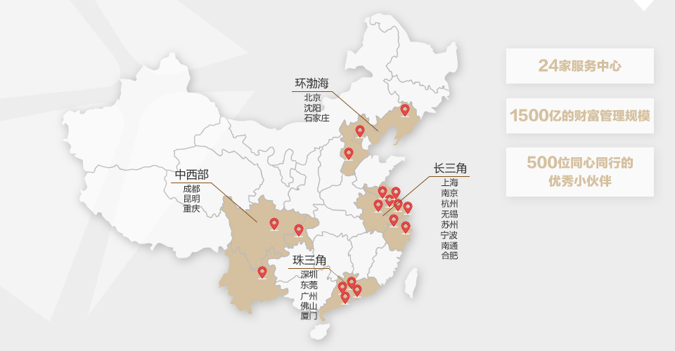 长三角、环渤海、珠三角和中西部共设立18个服务中心